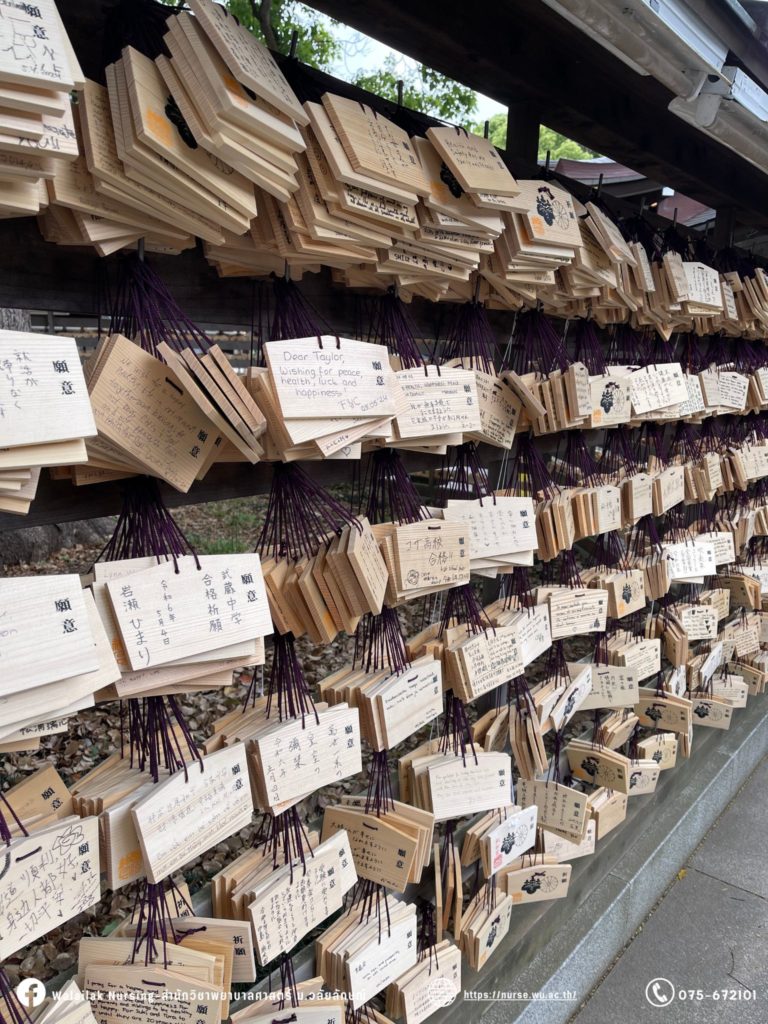 บรรยายกาศภายในศาลเจ้าเต็มไปด้วยผู้คน นักท่องเที่ยวทั้งชาวต่างชาติและชาวญี่ปุ่น ซึ่งช่วงที่เราไป เป็นช่วงที่ไม่มีหิมะแต่ยังคงมีอากาศหนาว ซึ่งสามารถเดินเล่นได้สบาย นอกจากนี้ในศาลเจ้ามีจุดให้เราเขียนคำอวยพรอธิษฐานใส่กระดาษ หรือแผ่นไม้ ซึ่งจะมีจำหน่ายแผ่นละ 100 เยน สำหรับครั้งนี้ เราเลือกเขียนในแผ่นกระดาษ ซึ่งเมื่อเขียนเสร็จเรียบร้อยแล้วก็นำไปหย่อนในกล่องไม้ที่ทางศาลเจ้าได้ตั้งไว้ และจุดสุดท้ายของศาลเจ้าที่เราได้แวะ คือจุดซื้อของฝาก ซึ่งจะมีเครื่องรางนำโชคต่างๆ จำหน่าย ไม่ว่าจะเป็นเรื่อง การงาน การเงิน การสอบ สุขภาพ นอกจากนี้มีจุดเสี่ยงเซียมซี ให้ได้เสี่ยงทายโชคกันด้วย