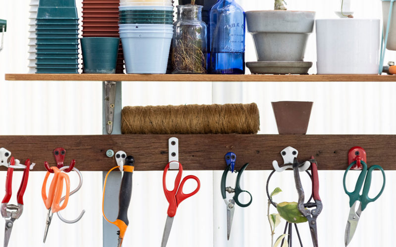 ส่วนสำคัญสำหรับจัดระเบียบให้ฟาร์มในบ้านน่าใช้งาน หยิบใช้อุปกรณ์ต่าง ๆ ได้ง่าย ทั้งหมวก รองเท้าบูท กระถางภาชนะปลูก พลั่ว จอบ เสียม กรรไกรตัดแต่งกิ่ง บัวรดน้ำ ถังน้ำ ถังสเปรย์ปุ๋ยน้ำ ไปจนถึงวัสดุปลูกอื่น ๆ ทั้ง ดิน กาบมะพร้าว เศษใบไม้ ขวดปุ๋ยหมักน้ำ เป็นต้นมุมเก็บอุปกรณ์ทำได้ทั้งแบบเปิดโล่งและเป็นห้องปิดมิดชิด แต่สิ่งสำคัญคือควรอยู่ใต้ชายคาไม่โดนฝนและความชื้นมาก เพื่อให้อุปกรณ์ไม่เกิดสนิม การจัดเก็บอุปกรณ์ควรเป็นระเบียบและง่ายต่อการหยิบใช้ โดยอาจแบ่งหมวดหมู่การจัดเก็บตามขนาดของอุปกรณ์ เช่น ประเภทที่มีด้ามยาวอย่างเสียบ จอบคราด เก็บในกลุ่มเดียวกัน อุปกรณ์ขนาดเล็ก เช่น มีด กรรไกร ตัดกิ่ง ห้อยแขวนไว้ด้วยกัน กลุ่มภาชนะปลูก อาทิ กระถาง ถุงปลูก เข่งพลาสติก จัดเก็บในชั้นวาง ให้เป็นระเบียบ จะช่วยให้ง่ายต่อการจดจำ