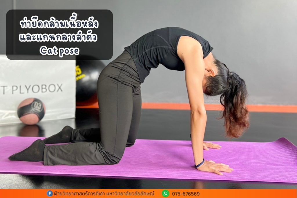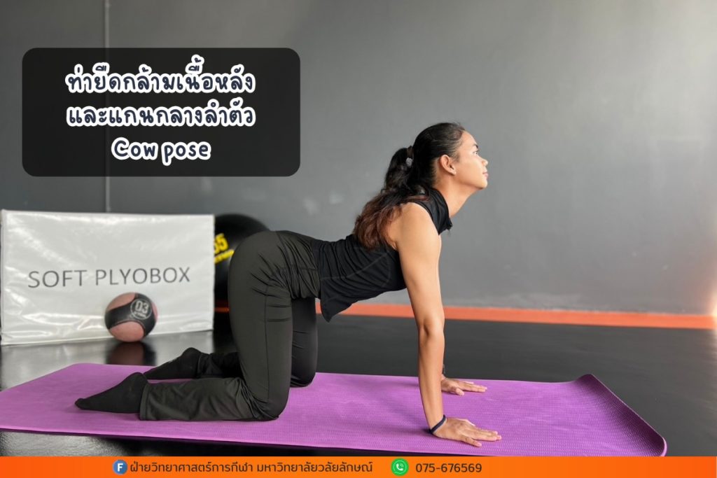 อยู่ในท่า “คลาน 4 จุด” (มือและเข่าติดพื้น) หายใจเข้า เงยหน้าแหงนมองเพดาน แอ่นหลังลงให้หน้าอกเปิดออก ค้างไว้ 5 วินาที