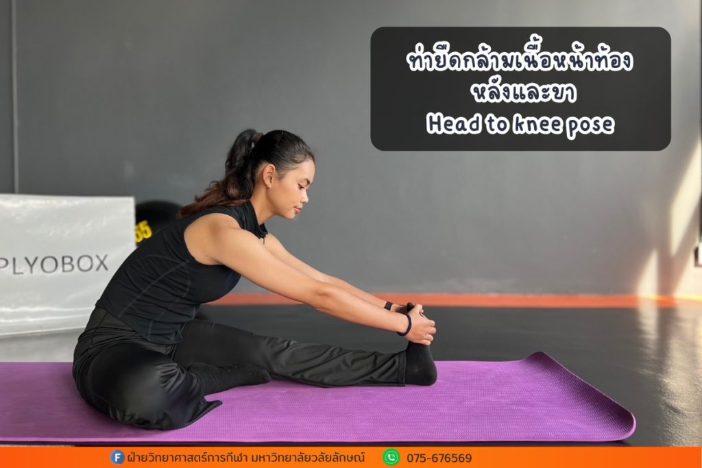 นั่งเหยียดขาข้างหนึ่งตรง อีกข้างงอให้ฝ่าเท้าชนต้นขาอีกข้าง โน้มตัวไปข้างหน้า พยายามให้หน้าผากแตะหัวเข่า (เท่าที่ทำได้) มือเอื้อมไปแตะปลายเท้า ค้างไว้ 30 วินาที แล้วสลับข้าง