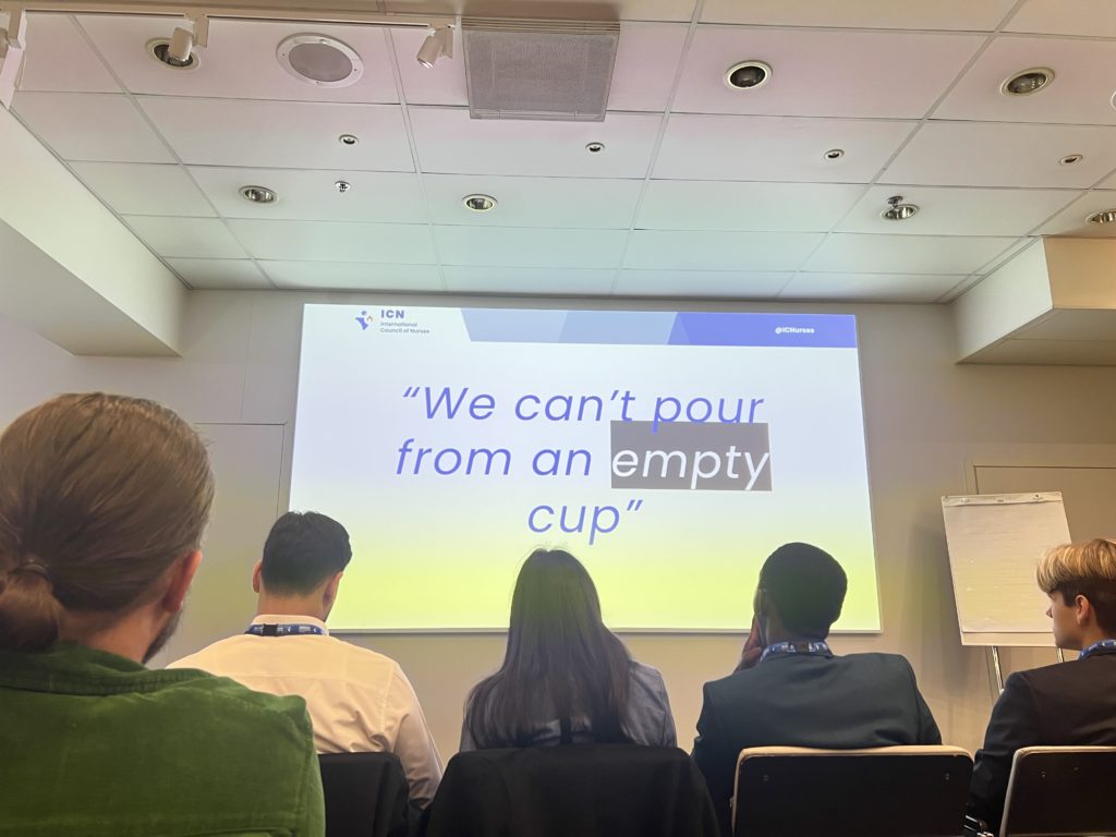 Day 1 (8 June 2025) กิจกรรมเริ่มต้นด้วยการเข้าร่วม ประชุมนักศึกษา (Students Assembly) ซึ่งกิจกรรมนี้จะเป็นเวทีสำคัญ ที่จัดขึ้นในการแลกเปลี่ยนความคิดเห็นและข้อมูล รวมถึงร่วมแบ่งปันประสบการณ์จากนักศึกษาพยาบาล หลากหลายสถาบันทั่วโลก ดิฉันรู้สึกตื่นเต้นและประหม่ามาก เนื่องจากครั้งนี้ ดิฉันจะได้พบกับประธาน ICN เป็นครั้งแรก เมื่อเริ่มการประชุม ได้มีพยาบาลรุ่นใหม่ (Early Nurses) ร่วมแบ่งปันประสบการณ์ของตน ตั้งแต่ช่วงที่เป็นนักศึกษาพยาบาล จนจบการศึกษา จากนั้นจะเป็นช่วงที่ประธานนักศึกษาพยาบาลจากแต่ละภูมิภาคทั่วโลกได้มาพูดคุย แลกเปลี่ยนมุมมอง ปัญหาของนักศึกษาพยาบาลที่เผชิญอยู่ รวมถึงมุมมองแนวโน้มในอนาคตที่อาจจะเกิดขึ้น ซึ่งโดยส่วนใหญ่ ปัญหาที่เกิดขึ้นพบมากที่สุด คือปัญหาในด้านการเงินในการศึกษา ภาวะหมดไฟในการเรียนหรือการทำงาน และปัญหาการย้ายถิ่นฐานเพื่อไปทำงานพยาบาลในต่างประเทศ นอกจากนี้ดิฉันได้ร่วมพูดคุยกับเพื่อนๆ นักศึกษาพยาบาล จากต่างสถาบัน ทั้งในประเทศไทย และต่างประเทศ ทำให้เห็นมุมมองการศึกษาพยาบาล บริบทความแตกต่างกันแต่ละที่ ทำให้เกิดการพัฒนาเครือข่ายนักศึกษาพยาบาลระหว่างประเทศ