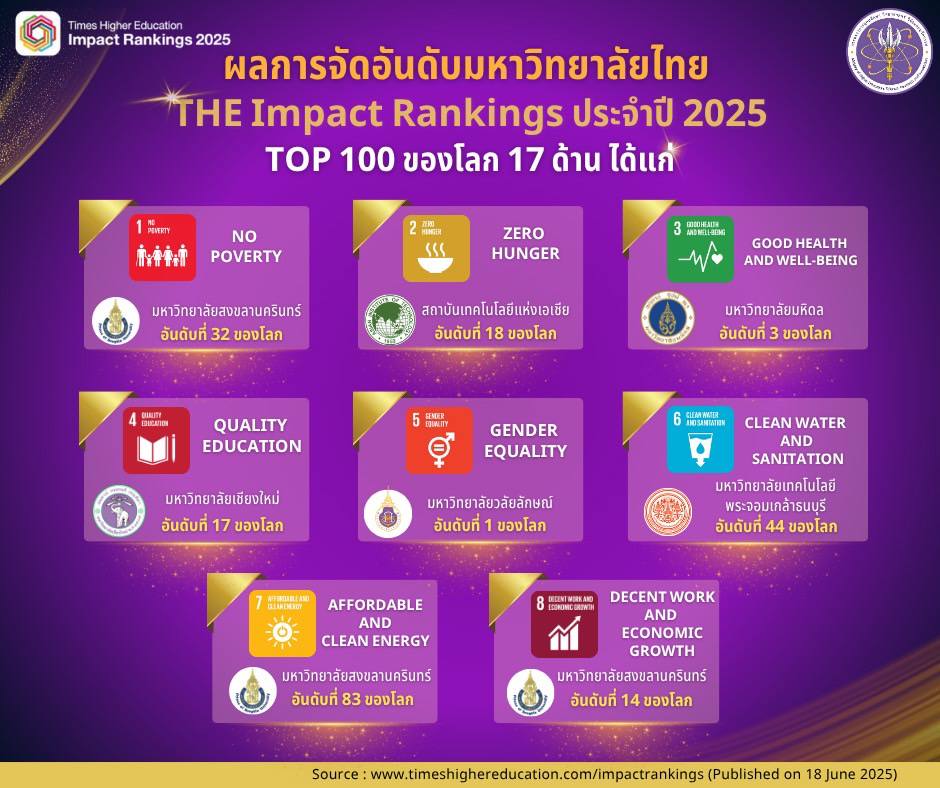 เมื่อวันที่ 24 มิ.ย. ศ.ดร.ศุภชัย ปทุมนากุล ปลัดกระทรวงการอุดมศึกษา วิทยาศาสตร์ วิจัยและนวัตกรรม (อว.) เปิดเผยว่า Times Higher Education (THE) หน่วยงานด้านการจัดอันดับสถาบันอุดมศึกษาชั้นนำของโลก ได้ประกาศผลการจัดอันดับสถาบันอุดมศึกษาที่มีการดำเนินงานเพื่อสนับสนุนเป้าหมายการพัฒนาที่ยั่งยืน (Sustainable Development Goals: SDGs) หรือ THE Impact Rankings ประจำปี 2568 โดยในปีนี้มีสถาบันอุดมศึกษาทั่วโลก เข้าร่วมการจัดอันดับทั้งหมด 2,526 แห่ง จาก 130 ประเทศและเขตเศรษฐกิจทั่วโลก และมีสถาบันอุดมศึกษาไทยเข้ารับการจัดอันดับทั้งสิ้น 83 แห่ง เพิ่มจากปี 2567 ซึ่งมีจำนวน 77 แห่ง ซึ่งผลการจัดอันดับปรากฎว่า มี 5 สถาบันอุดมศึกษาไทยอยู่ในอันดับ Top 100 ของโลก แบบคะแนนรวม ได้แก่ จุฬาลงกรณ์มหาวิทยาลัยและมหาวิทยาลัยเชียงใหม่ อันดับที่ 44 มหาวิทยาลัยมหิดลและมหาวิทยาลัยธรรมศาสตร์ อันดับที่ 64 และมีมหาวิทยาลัยวลัยลักษณ์ อันดับที่ 93 ซึ่งขยับมาอยู่ในอันดับ Top 100 เป็นปีแรก อีกทั้งยังเป็นสถาบันอุดมศึกษาอันดับ 1 ของโลกที่ได้รับคะแนนสูงสุดในการดำเนินงาน SDGs เป้าหมายที่ 5 ความเท่าเทียมทางเพศ (Gender equality) นอกจากนี้ ยังมีสถาบันอุดมศึกษาไทยอีกหลายแห่งที่ได้รับการจัดอันดับที่ 101-200 ของโลก ได้แก่ สถาบันเทคโนโลยีแห่งเอเชีย (AIT) มหาวิทยาลัยเกษตรศาสตร์มหาวิทยาลัยขอนแก่น มหาวิทยาลัยเทคโนโลยีพระจอมเกล้าธนบุรี และมหาวิทยาลัยสงขลานครินทร์