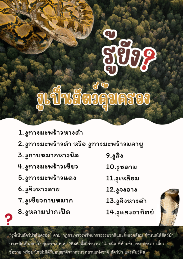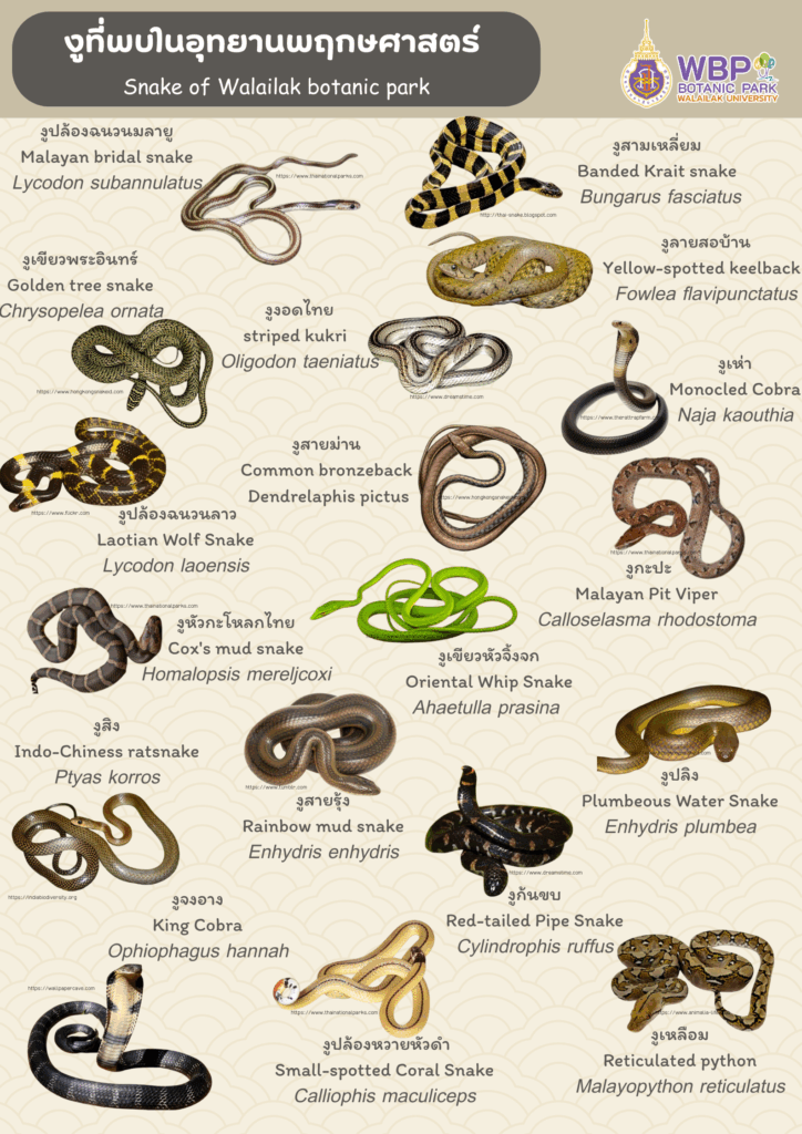 งูที่พบมีทั้งชนิดมีพิษและไม่มีพิษ รวมไปถึงชนิดที่เป็นสัตว์ป่าคุ้มครอง เช่น งูทางมะพร้าว งูสิง และงูแสงอาทิตย์ ซึ่งล้วนเป็นสายพันธุ์ที่เราสามารถพบเจอได้ทั่วไป ข้อมูลการสำรวจเหล่านี้ไม่เพียงแต่สะท้อนถึงความหลากหลายทางชีวภาพ แต่ยังเป็นฐานข้อมูลสำคัญต่อการจัดการพื้นที่อนุรักษ์ การศึกษาวิจัย การพัฒนาการท่องเที่ยวเชิงนิเวศ และการเผยแพร่ความรู้แก่สังคมเกี่ยวกับความสำคัญของงูในธรรมชาติ