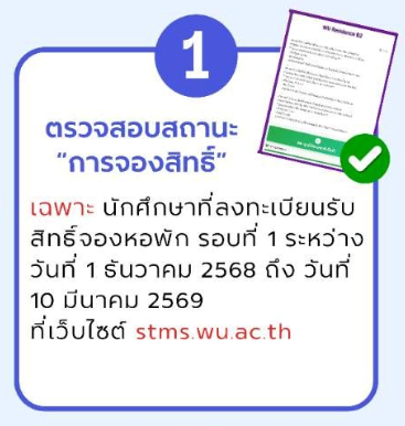 สำหรับนักศึกษาที่ลงทะเบียนรับสิทธิ์จองหอพัก รอบที่ 1 ระหว่างวันที่ 1 ธันวาคม 2568 – 10 มีนาคม 2569 ผ่านเว็บไซต์ stms.wu.ac.th หลังจากที่นักศึกษาได้ดำเนินการ ยืนยันสิทธิ์ในระบบ myTCAS เรียบร้อยแล้ว อย่าลืมดำเนินการตามขั้นตอนสำคัญที่มหาวิทยาลัยกำหนด เพื่อให้การจองหอพักเสร็จสมบูรณ์และไม่เสียสิทธิ์ในการเข้าพักในหอพักนักศึกษา นักศึกษาควรตรวจสอบข้อมูลและดำเนินการตามกำหนดเวลาที่ระบุไว้อย่างเคร่งครัด เนื่องจากแต่ละขั้นตอนมีความสำคัญต่อการยืนยันสิทธิ์การเข้าพัก หากไม่ดำเนินการตามระยะเวลาที่กำหนด อาจทำให้สิทธิ์การจองหอพักถูกยกเลิกได้ ดังนั้นจึงควรติดตามประกาศและรายละเอียดจากมหาวิทยาลัยอย่างต่อเนื่อง