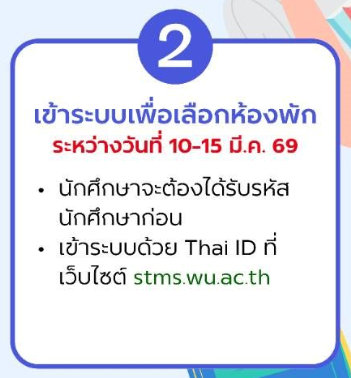 นักศึกษาจะต้องดำเนินการ เลือกห้องพักผ่านระบบออนไลน์ ระหว่างวันที่ 10 – 15 มีนาคม 2569 โดยก่อนเข้าสู่ขั้นตอนการเลือกห้องพัก นักศึกษาจะต้องได้รับ รหัสนักศึกษา จากมหาวิทยาลัยก่อน จากนั้นจึงสามารถเข้าสู่ระบบด้วย Thai ID เพื่อดำเนินการเลือกห้องพักผ่านเว็บไซต์ stms.wu.ac.th การเลือกห้องพักเป็นขั้นตอนที่นักศึกษาต้องดำเนินการด้วยตนเอง เพื่อเลือกห้องพักตามความต้องการ ทั้งนี้ ห้องพักมีจำนวนจำกัด นักศึกษาจึงควรดำเนินการเลือกห้องพักภายในช่วงเวลาที่กำหนด เพื่อให้มีโอกาสเลือกห้องพักที่เหมาะสม