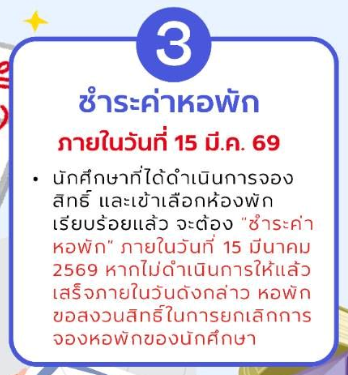 หลังจากนักศึกษาได้ดำเนินการจองสิทธิ์และเลือกห้องพักเรียบร้อยแล้ว ขั้นตอนสำคัญถัดไปคือ การชำระค่าหอพัก โดยนักศึกษาจะต้องดำเนินการชำระเงิน ภายในวันที่ 15 มีนาคม 2569 หากนักศึกษาไม่ดำเนินการชำระค่าหอพักภายในระยะเวลาที่กำหนด ทางฝ่ายหอพักนักศึกษาจะขอสงวนสิทธิ์ ยกเลิกการจองห้องพักของนักศึกษา เพื่อเปิดโอกาสให้ผู้ที่ต้องการห้องพักรายอื่นสามารถเข้ามาจองได้