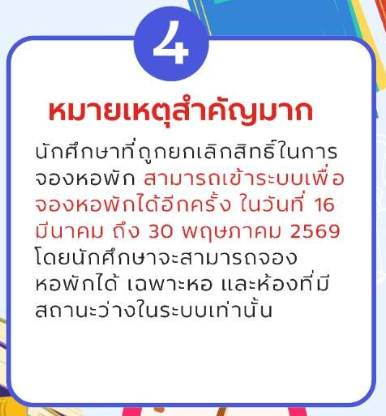 ในกรณีที่นักศึกษาถูกยกเลิกสิทธิ์การจองหอพัก นักศึกษายังสามารถกลับเข้ามาดำเนินการจองหอพักได้อีกครั้ง ระหว่างวันที่ 16 มีนาคม – 30 พฤษภาคม 2569 โดยสามารถเลือกจองได้เฉพาะ หอพักและห้องที่ยังมีสถานะว่างในระบบเท่านั้น ดังนั้นนักศึกษาควรดำเนินการทุกขั้นตอนให้ครบถ้วนตามระยะเวลาที่กำหนด เพื่อไม่ให้พลาดโอกาสในการเข้าพักในหอพักของมหาวิทยาลัย