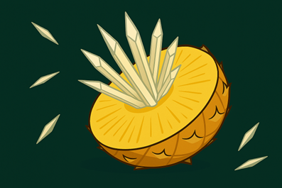นอกจากเอนไซม์แล้ว สับปะรดยังมีอาวุธที่น่าทึ่งอย่าง ผลึกแคลเซียมออกซาเลต หรือที่เรียกว่า“ราไฟด์” ซึ่งหากส่องดูผ่านกล้องจุลทรรศน์ จะเห็นเป็นแท่งผลึกรูปร่างเหมือนเข็มที่แหลมคมจำนวนมหาศาลเมื่อเรากัดเนื้อสับปะรด เข็มจิ๋วเหล่านี้จะถูกดีดออกมาทิ่มแทงลิ้นเราให้เกิดแผลขนาดจิ๋ว เพื่อเปิดทางให้เจ้าเอนไซม์โบรมีเลน ซึมเข้าไปย่อยสลายโปรตีนได้ลึกขึ้น! เรียกว่าเป็นการทำงานร่วมกันของอาวุธที่สมบูรณ์แบบสุดๆ