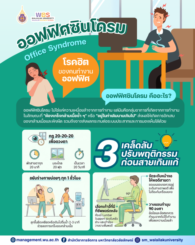 ในสังคมปัจจุบันที่การทำงานส่วนใหญ่ขับเคลื่อนด้วยเทคโนโลยี เรามักพบว่าตัวเองใช้เวลาอยู่หน้าจอคอมพิวเตอร์หรือสมาร์ทโฟนเฉลี่ย 8-12 ชั่วโมงต่อวัน ความเคยชินเหล่านี้กำลังสะสมกลายเป็นระเบิดเวลาที่เรียกว่า “ออฟฟิศซินโดรม” (Office Syndrome) ซึ่งหากปล่อยไว้ไม่เพียงแต่จะทำลายสุขภาพกาย แต่ยังส่งผลกระทบต่อประสิทธิภาพในการทำงานและความสุขในการใช้ชีวิตด้วย