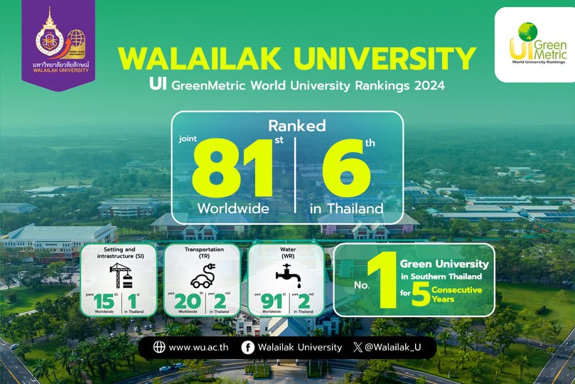 Walailak University has championed green campus initiatives and the promotion of environmental sustainability in Southern Thailand for five consecutive years. The university is now ranked